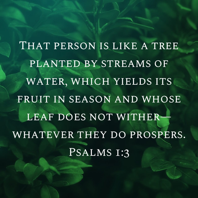 The writer of Psalm 1 compares the righteous to a tree planted by streams of water, and the comparison is fitting. When a tree has a generous water source, it thrives and grows strong and fruitful. What’s more, that strong and fruitful tree can share nutrients with other trees further from the stream, via a network of fungal strands in the soil. As children of God, we live and grow near streams of living water. The psalmist encourages us to meditate on the Lord’s law day and night so we may prosper.